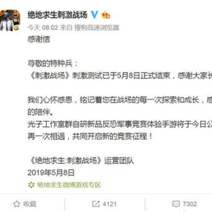 中新网客户端北京5月8日电(记者 吴涛)8日,腾讯游戏《刺激战场》微博上发公告称,刺激测试正式结束,同时由同一个工作室,即光子工作室群研发的《和平精英》公测。两个游戏均为“吃鸡”类游戏,《刺激战场》用户可一键迁移账号至《和平精英》。