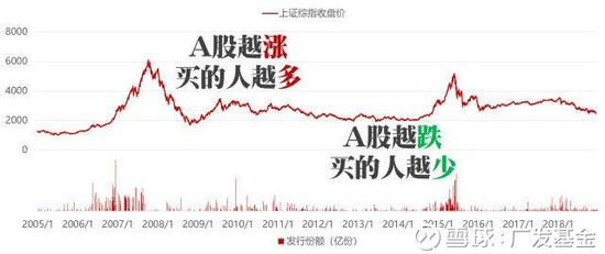 下述图表中上图是上证综指2005年初到2018年末的涨跌走势图,下图是该时间内偏股型及普通型基金发行份额,简单而言就是大家买入的新权益基金份额。可以看到市场涨起来之后,买基金的人很多,市场跌下去之后,买的人非常少。