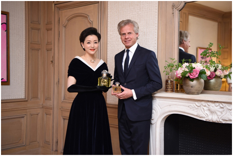 法国娇兰CEO Laurent Boillot先生与中国知名媒体人杨澜女士手持LAN香水合影