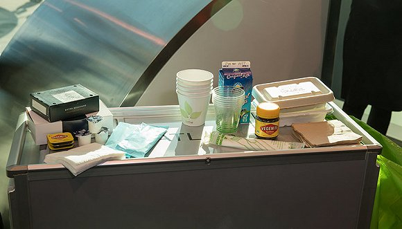 比如,环保纸杯源自植物而非石油制成的塑料,环保纸巾使用FSC认证的纸浆制成,环保食盒由精炼厂剩余的甘蔗渣制成,环保餐具由来源于非转基因农作物的淀粉制成。所有的替代制品全部能够完全降解。在乘客用餐结束后,乘务员收回剩余的所有物品,进行分类再利用、再回收或者用以堆肥。