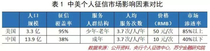 毫无疑问,国内个人征信尚且是一个蓝海市场,广阔而又亟待开拓。虽然无法具体测算市场空间有多大,但我们可以从几个指标来探寻市场规模,窥一斑而知全豹,并对比征信行业发达的美国来加以验证。