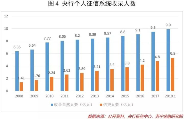 我国的征信行业是“政府+市场”双轮驱动的发展模式,截止2019年,央行征信中心已经收录自然人9.9亿人,有信贷记录人数5.3亿,征信覆盖率为38%(与总人口对比)。