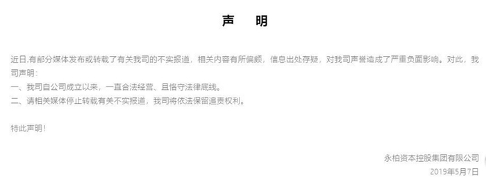 记者随即拨通永柏资本官网上公布的电话,被告知为空号。不过蹊跷的是,就在5月7日,永柏资本又在官网首页发出了另外一则公告,称此前媒体报道公司失联跑路为不实消息。