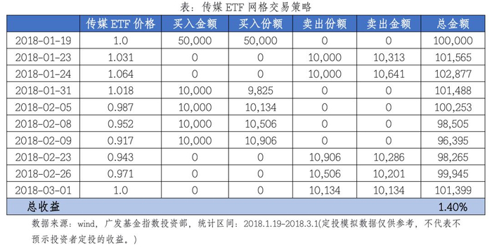 按照这个方法,我们选取从传媒上市日期2018年1月19日至2018年3月1日这个区间,共交易9次,传媒ETF涨幅为0%,运用网格投资法的具体操作如下表所示,采用网格法最终收益能够达到1.40%,高于一次性投资收益。