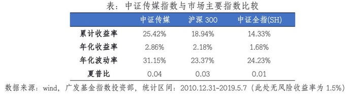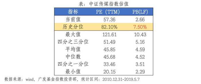 首先,从估值情况来看,截至2019年5月7日中证传媒指数市盈率PE(TTM)为57.36,市净率PB(LF)为2.66。市净率所处历史分位比例为7.50%,位于历史市净率的较低水平。市盈率处在一个较高的历史分位,这主要是因为今年很多传媒行业上市公司计提商誉,预计以后年度估值会回归到一个较低的区间,因此中证传媒指数仍然具备长期投资价值。