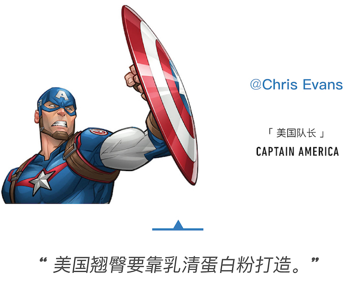 先把美队Chris Evans拿出来做例证,实在是因为他身材好,颜值高,最近又因为“美国翘臀”而红遍全球。其实Chris Evans的身材变化跟美国队长这一角色还挺相近,在出演美队之前Chris Evans也算是比较瘦弱的体型,通过高强度的健身才练成如今的魔鬼身材,而他在之前的采访中也有透露过他健身的零食是各种坚果、水果,还有必备的乳清蛋白粉。