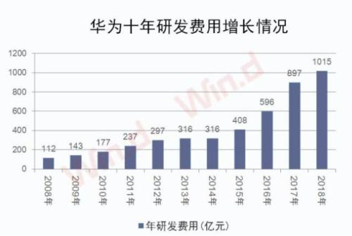 近十年来,华为累计投入的研发费用超过了4800亿元。而在2018年华为研发费延续高增长,公司全年营收7311亿元,研发费用达到1015亿元人民币,同比增长13.2%。