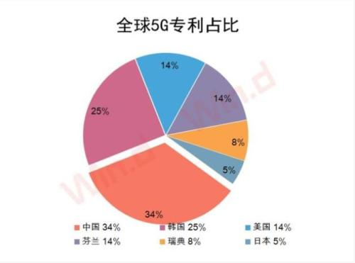 据公开数据显示,在全球5G专利申请数量中,中国占34%,位居各国之首,此后紧随的是韩国,占25%,美国和芬兰各占14%,瑞典约8%,日本约5%。