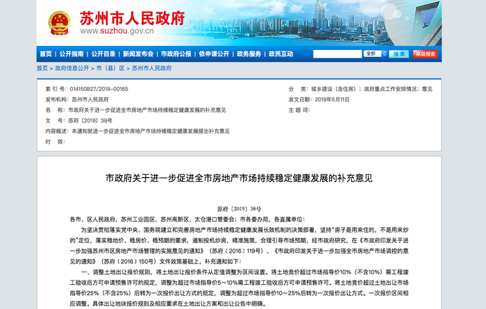 5月11日,苏州市人民政府发布《市政府关于进一步促进全市房地产市场持续稳定健康发展的补充意见》(下称《意见》),宣布在苏州工业园区全域、苏州高新区部分重点区域,新房限售3年;苏州工业园区全域二手房,限售5年。同时还对土地出让报价规则进行调整,将土地出让报价条件从定值调整为区间设置。