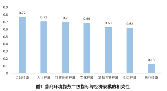 《营商环境报告》显示,金融环境、人才环境、技术创新环境、文化环境、基础设施环境、生活环境、自然环境与经济规模的相关性分别为0.77、0.71、0.70、0.69、0.63、0.62和0.13,所有营商环境指数的二级指标均与经济规模呈现正相关关系,其中金融环境相关性最高,人才环境、技术创新环境和文化环境仅次于金融环境,自然环境相关性最低。