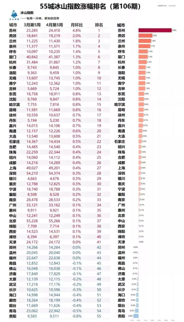 《55城冰山指数涨幅排名(第106期)》数据显示,苏州已超越燕郊连续5期位居55城冰山指数涨幅榜榜首,也就是说,苏州房价已经连续五周月环比上涨幅度居55城首位。