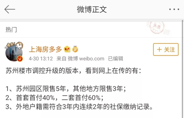 值得注意的是,此次“限售”新政的出台早有传言。在五一劳动节房价之前,不少苏州当地房产机构就曾曝出网传的“苏州楼市调控升级版本”,而多家媒体也相继报道,称“苏州楼市调控政策正在酝酿中”。