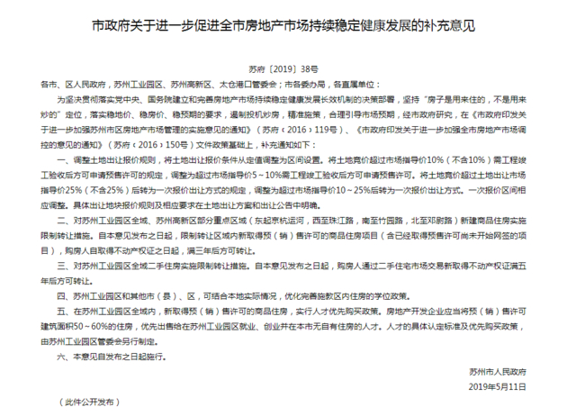 5月11日晚间,苏州市政府出台了关于进一步促进全市房地产市场持续稳定健康发展的补充意见。根据意见,即日起,苏州工业园区全域、苏州高新区部分重点区域,新房限售3年;苏州工业园区全域二手房,限售5年。