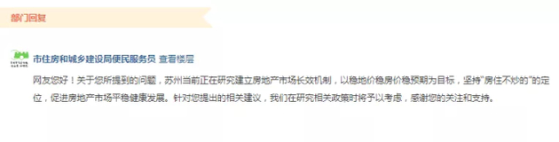 据国际金融报报道,苏州市住房和城乡建设局近日在官方平台针对房价上涨等问题回复网友称,苏州当前正在研究房地产市场长效机制,以稳地价稳房价稳预期为目标,坚持“房住不炒”的定位,促进房地产市场平稳健康发展,针对提出的相关建议,在研究相关政策时将予以考虑。