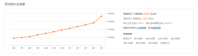 安居客数据显示,苏州二手房均价自去年6月以来已连续11个月环比出现上涨,特别是5月以来环比涨幅明显扩大,达到18680元/平米,环比上涨4.74%,同比涨幅已达到19%。