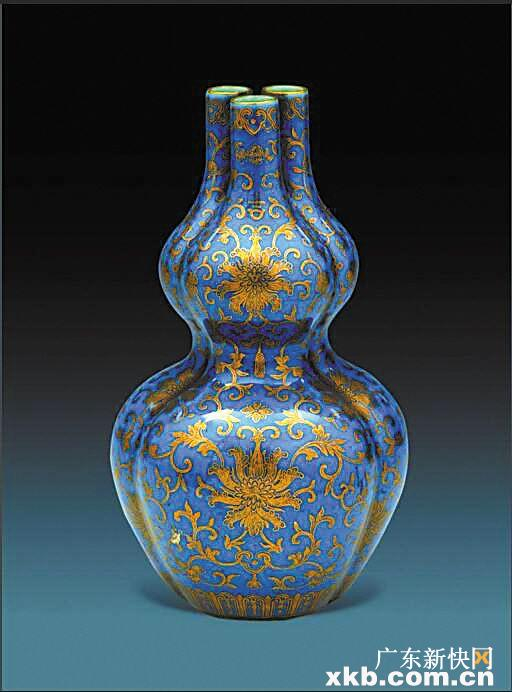 天蓝釉地描金 彩缠枝莲纹三孔葫芦瓶