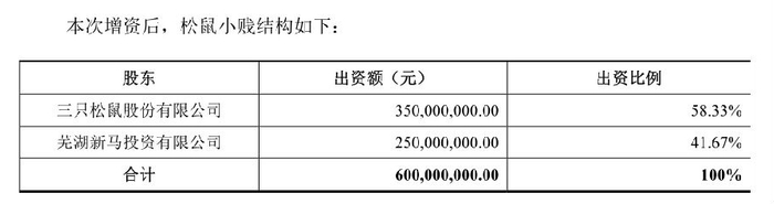 据了解,2016年5月,三只松鼠注册地的芜湖市弋江区国有公司——芜湖新马投资有限公司与松鼠小贱、三只松鼠签署《注资协议书》,由新马投资向松鼠小贱注资2.5亿元人民币,注资完成后,松鼠小贱由三只松鼠全资子公司变更为三只松鼠控股子公司(三只松鼠持有 58.33%,新马投资持有41.67%)。