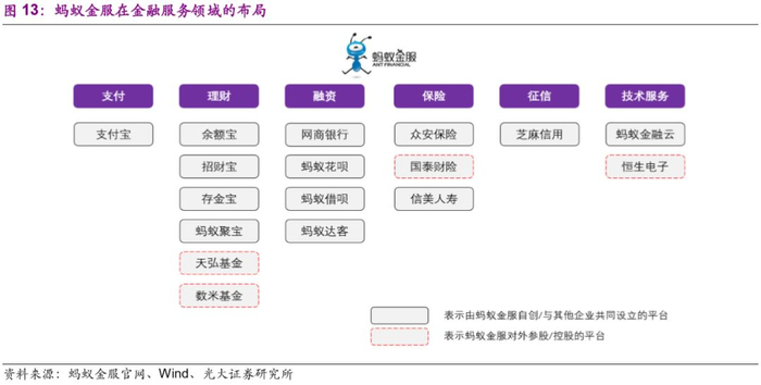 蚂蚁金服通过内生创设和外延扩张,打造全金融服务生态圈。自创始以来,蚂蚁金服通过内生创设和外延扩张,搭建了以支付、理财、融资、保险、征信、技术服务为核心的六大业务板块,涵盖了以支付宝、余额宝、网商银行、蚂蚁花呗、蚂蚁借呗、芝麻信用等为代表的明星产品。