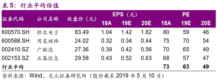 基于以上假设,预计2019-2021年公司商品销售收入分别为38、45、51亿,定制软件业务收入分别为5.4、6.1、6.9亿,系统集成业务收入分别为2.3、2.4、2.5亿。预计2019-2021年公司收入分别为58、67、77亿,表净利润分别为2.1、2.9、4.1亿。
