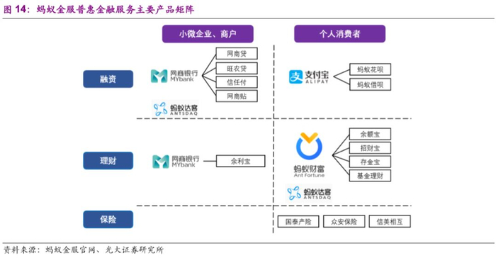 蚂蚁金服聚焦于小微企业、商户和个人消费者三类目标客户,提供全方位的普惠金融服务。公司深耕小微企业、商户和个人消费者三类客户群体,专注于融资、理财、保险等业务,打造全方位普惠金融服务生态圈。公司对小微企业和商户的投融资服务主要依托于网商银行和蚂蚁达客两大抓手;对个人消费者的小贷业务主要借助于支付宝旗下的蚂蚁花呗和蚂蚁借呗两大产品,投资、理财服务主要通过蚂蚁财富和蚂蚁达客两大平台来实现,个人保险业务网则主要涵盖入股的众安、国泰、信美三家保险公司。