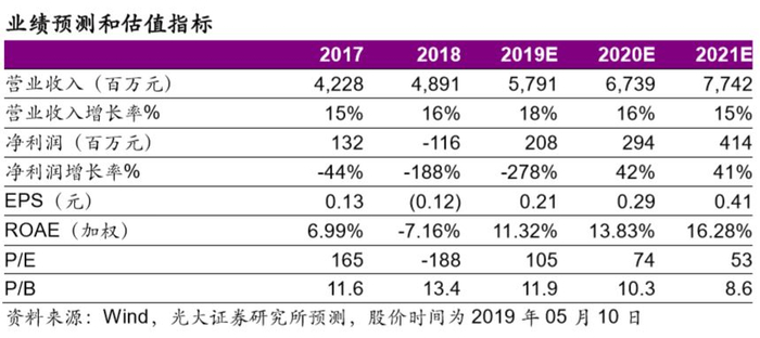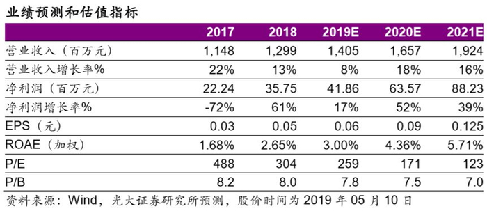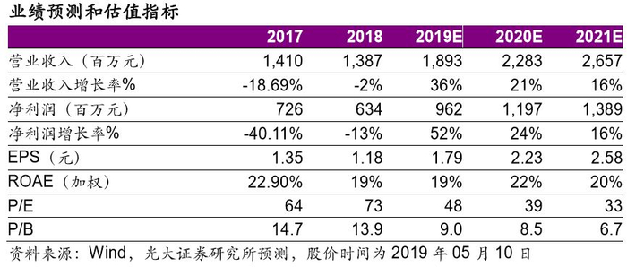 此外,我们假设公司投资收益在2019-2021年保持不变。基于以上假设,预计2019-2021年公司收入分别为14.5、17.1、19.8亿,净利润分别为4,170、6,676、9,620万。