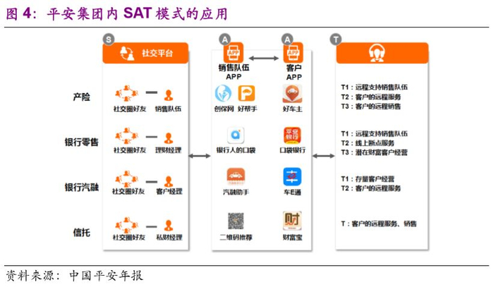 SAT(社交辅助营销)颠覆传统销售模式,帮助代理人实现对客户的实时连接、高频互动和精准营销,智能生成产品、服务、渠道和接触时机,推送接触线索至客户和代理人。2018年SAT系统已触达人数2.2亿人次,互动次数13亿次,配送线索10.8亿条。