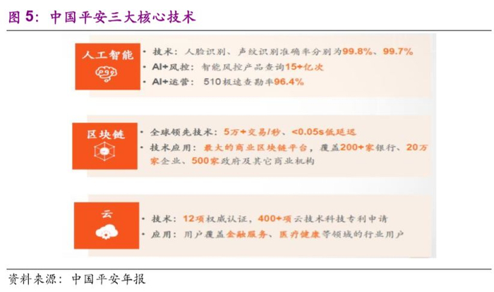 3.1、中国平安:科技赋能五大生态,对外输出提升估值中国平安始终坚持“金融+科技”、“金融+生态”战略,重视科技研发投入,是国内金融机构发展科技的先行者。平安自成立以来经历了三个阶段,1.0时代(1988-2005年),主打线下资源,发展为全国性综合金融集团,核心是传统渠道和产品导向;2.0时代(2006-2015年),运用互联网技术升级综合金融模式,实现内部横向迁徙;3.0时代(2016-),将“互联网+金融”模式向全行业开放,全面提升客户体验。平安早在2006年起就开始金融科技的布局,并将其逐渐扩展到五大生态圈,现已实现向外输出,在金融科技这一未来竞争的主战场上先发优势明显。目前,公司拥有人工智能、区块链、云计算三项核心技术,每年研发投入占营收的1%,持续加大对科技支持力度。