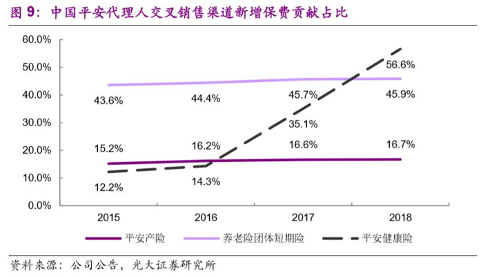 随着生态圈的完善,公司内部横向迁徙明显增加,交叉销售贡献占比不断提升。2018年通过代理人渠道实现平安产险、养老险团体短期险和平安健康险新增保费合计514.53亿元,同比增长18.8%,交叉销售渠道贡献占比分别达到16.7%、45.9%、56.6%。交叉销售降低了企业的获客成本及难度,有效提升用户价值。截至2018年末,总计6,364万人持有集团多家子公司合同,占集团客户总数的34.6%,同比提升6.1ppts,客均合同数同比增长9.1%至2.53份,客均营运利润同比增长18.1%至531元。生态圈建设及科技应用使得集团内部协同效应及客户黏性不断增强。