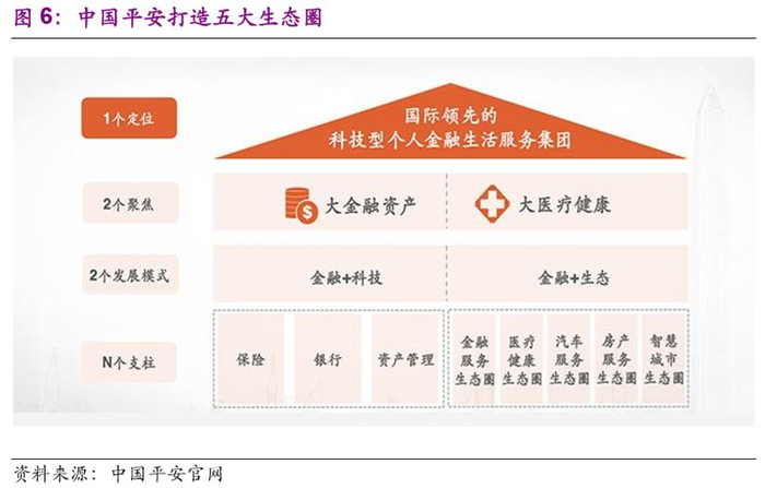 目前,平安搭建起“金融服务、医疗健康、汽车服务、房产服务、智慧城市”五大生态圈,三大技术深度赋能核心业务的多个方面,全面支撑生态圈建设。此外,平安推行“一个客户、多种产品、一站式服务”的综合金融经营模式,运用互联网科技及线下网点布局协同获客,凭借生态圈建设为用户提供全面的金融、医疗等服务,促进内部迁徙,降低获客成本;同时运用科技提升各流程效率及服务质量,以低成本提升客户体验,增强粘性。