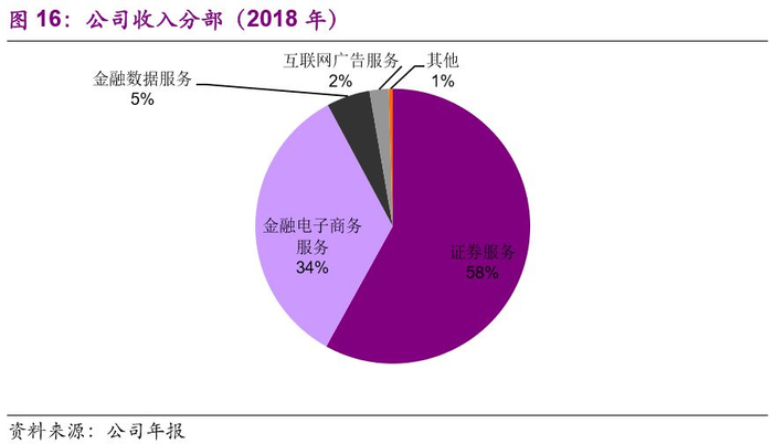 ◆公司业务介绍:公司主要业务包含证券业务、金融电子商务服务业务、金融数据服务业务及互联网广告服务业务等。其中证券业务收入占比58%,金融电子商务服务收入占比34%,是公司主要的收入及利润来源。