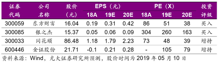 公司当前估值51x 2019年PE,基本处于历史均值水平。我们认为,2019年以来股市表现强劲,市场成交活跃,风险偏好提升,公司估值有望提升。结合同业估值及公司历史估值,给予公司60x 2019年PE,对应目标价18.87元,首次覆盖给予“买入”评级。