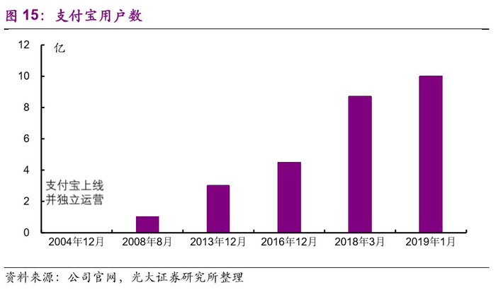 受益于便利快捷的客户体验,多元的金融服务,蚂蚁金服实现用户数量快速增长,业务规模迅速提升。以支付宝为例,自2004年12月上线并独立运营开始,支付宝用户数实现持续快速提升。截至2019年1月,支付宝全球用户数已经超过10亿。