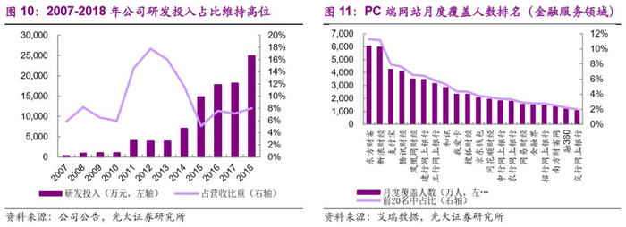 东方财富重视技术研发,每年保持着较高比例的研发投入,2007-2018年研发投入在营收中的占比平均达到9.51%。高研发投入保证了公司在技术层面保持领先,并成功应用到相关服务中。公司流量入口东方财富网以数据全面、迅速、免费受到广大个人投资者的青睐,此外社交性质的股吧、财富号、博客给予了投资者发表见解、相互交流的平台,满足了交易线上化后股民交流的需要。根据艾瑞数据统计显示,2019年2月,东方财富网以月度覆盖6,058万人位居金融服务网站首位,在前20名中占比达到11.27%,流量龙头的地位显著,为公司平台化经营提供了大流量的前提。