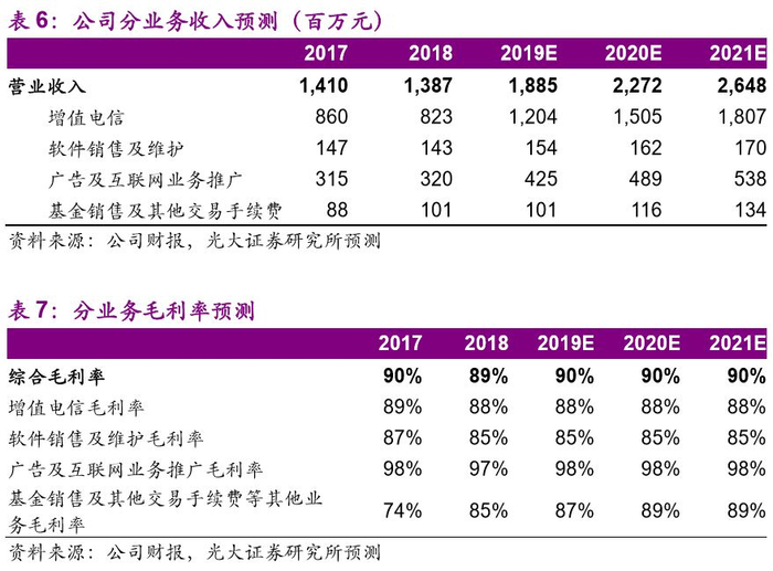 (1)随着市场环境好转,投资者对于金融资讯及信息服务需求提升,预计2019-2021年公司增值电信业务收入同比分别增长40%、25%、20%。