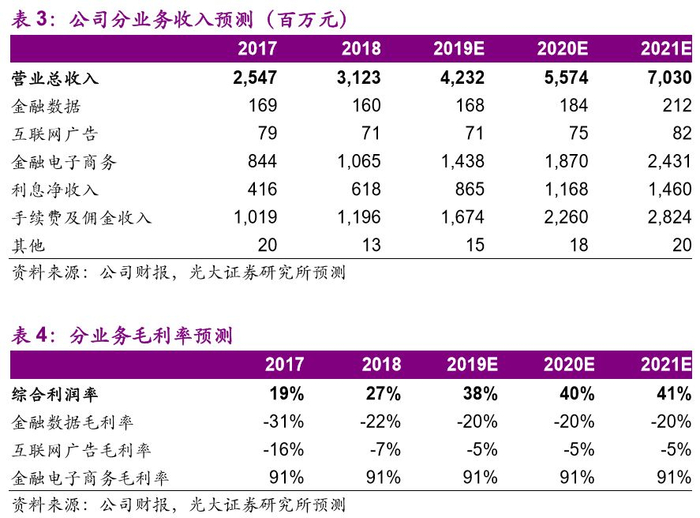 (4)随着市场环境好转,以及人均可支配收入提升,预计2019-2021年公司金融电子商务收入同比分别增长35%、30%、30%。