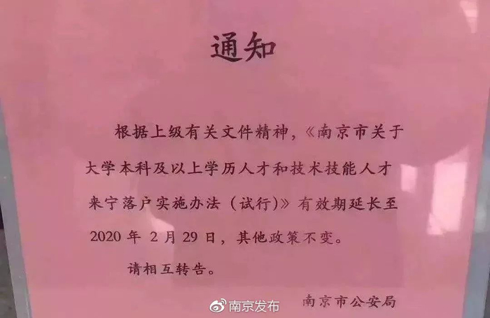 不过,在上述“人才落户”政策进入倒计时的最后两天,南京这场“人才争夺战”的战线被再度拉长,南京市公安局发布通知称,将该政策的有效期延长一年至2020年2月29日。