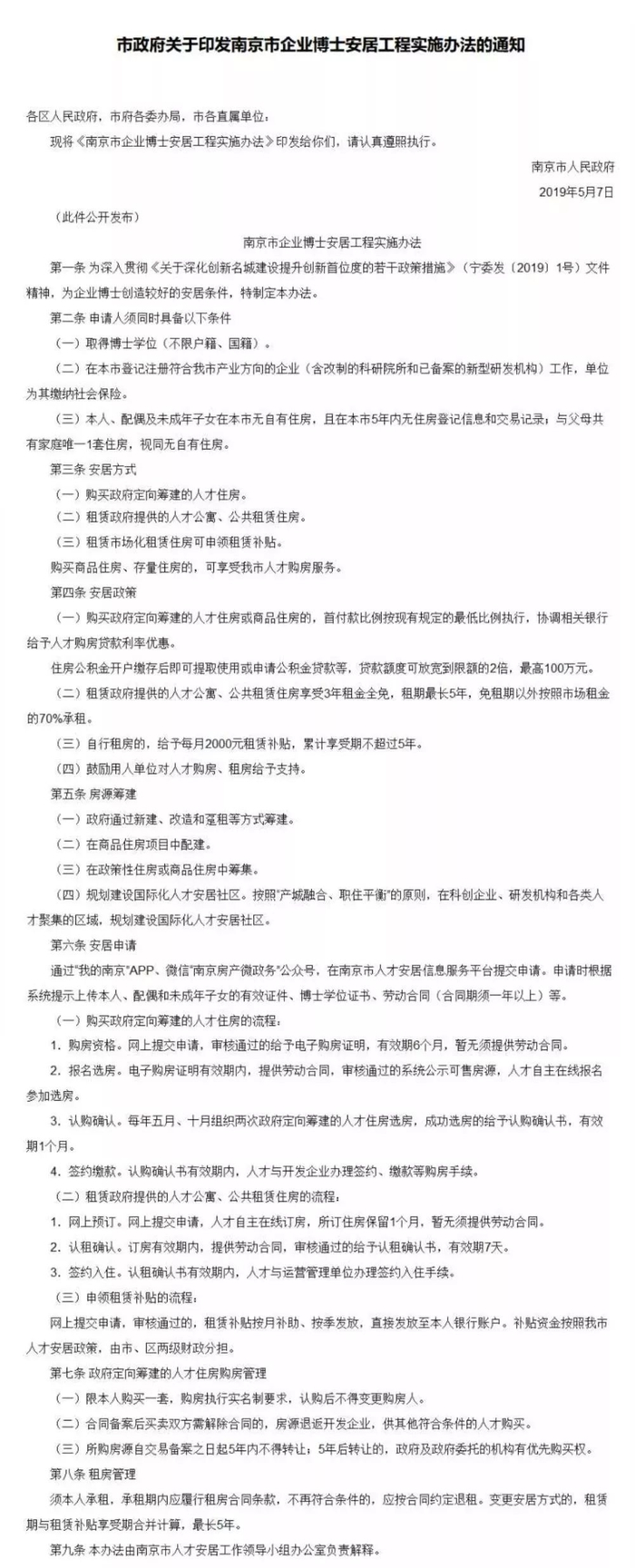 5月13日,距离南京留交会尚不到一周,南京市人民政府正式印发《南京市企业博士安居工程实施办法的通知》,对在宁企业工作的博士提供住房、租房等一系列安居政策。