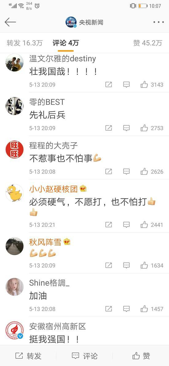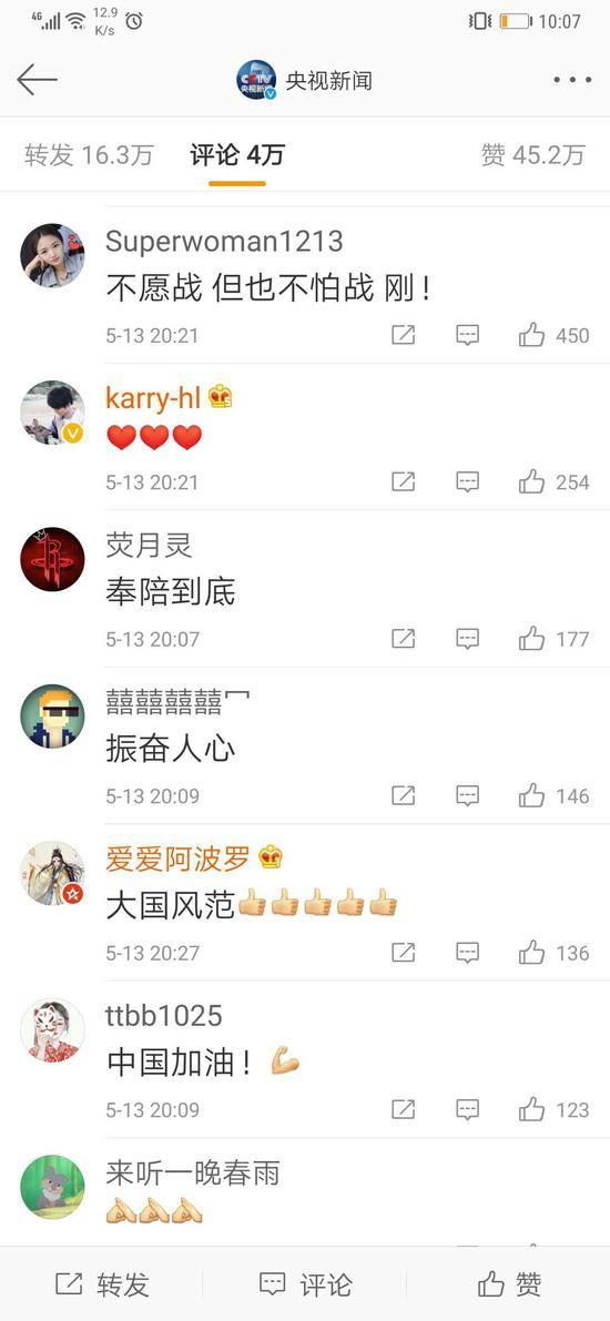 节目播出后,央视新闻官方微博转发数小时,播放量和阅读量就已双双突破3000万,单条微博的点赞数量超110万,网友留言热烈,纷纷点赞这篇评论言之有理、“威武”、“霸气”,同时,表示大力支持政府的反制措施,“面对原则问题绝不低头”。