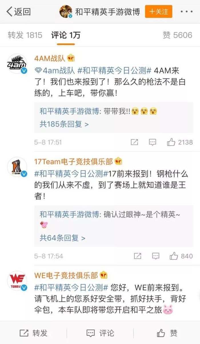 在《和平精英》的官微评论区,一批电子竞技俱乐部官方大号在此集结。这也在一定程度上反映了吃鸡产品与移动电竞得紧密联动号召力。