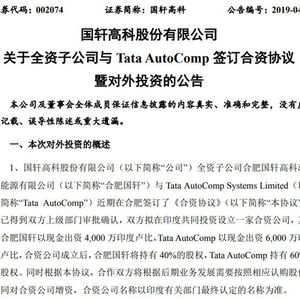 【TechWeb】5月14日消息,深交所上市公司国轩高科日前发布公告称,子公司与Tata(Tata AutoComp)拟在印度设立一家合资公司。