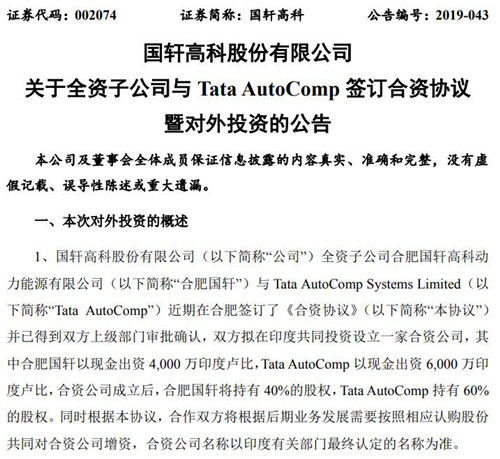 国轩高科子公司与Tata拟在印度设立一家合资公司