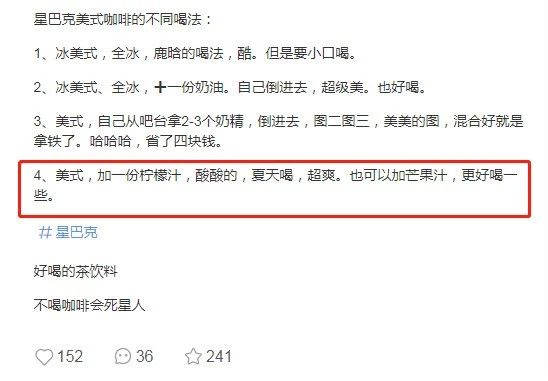 “你喝过往星巴克的冰美式里面加柠檬汁吗?味道嘛,就像是一杯变了味的酸梅汤。”一位星巴克的忠实消费者在接受记者采访时这样说到,他还告诉记者,这杯星巴克的“隐藏菜单”是他在某社交媒体上看到的,并表示,自己再也不会去尝试这种所谓的“隐藏菜单”了。
