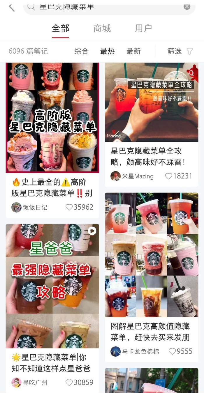 以网络上“隐藏菜单”的最早成名者----星巴克为例,《国际金融报》记者在某社交平台上搜索“星巴克隐藏菜单”,发现这些“隐藏菜单”的帖子不仅点赞数、收藏数很高,而且有不少读者在评论里表示愿意尝试。