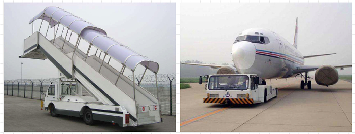 (5)机场地勤设备包括不限于:搬运车、舱内作业机械、充氧车、除冰车、传送车、登机车、电源车、飞机引导车、高空作业车、行李传送车、加油车、客梯车、空调车、跨运车、垃圾车、冷藏车、气源车、清水车、升降平台车、食品车、污水车等;