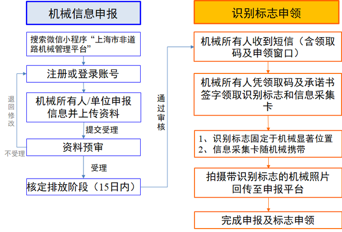 机械所有者可根据市生态环境局配套出台的《上海市非道路移动机械申报登记和标志管理办法(试行)》,在“上海市非道路机械管理平台”上或到各区指定办事窗口进行申报登记,领取识别标志。