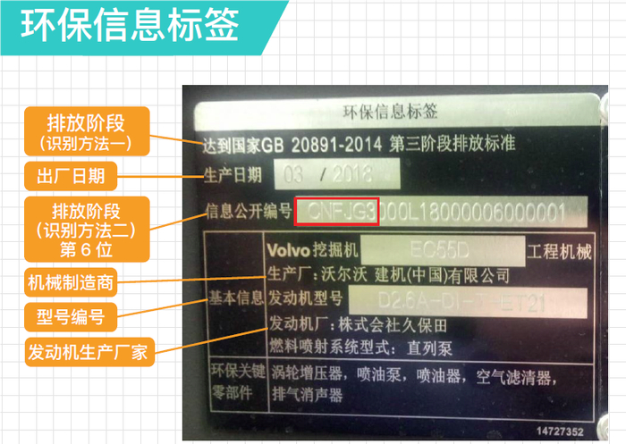 (一)有机械环保信息标签的,从环保信息标签上读取机械环保信息公开编号,环保信息公开编号为24位,第6位是机械对应的排放阶段。