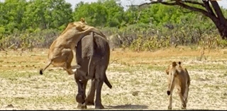 狮子不会攻击体积庞大的成年象,它们专挑落单的小象下手。