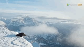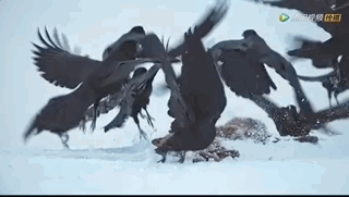 在暴风雪侵袭的冬季,挪威山峰上的一只雄性金雕,已然放下面子,与乌鸦争夺腐食。