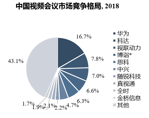 中国视频会议系统市场正处于市场发展的成长期,市场发展较快,竞争激烈。当前,中国视频会议市场高度集中,会议系统市场主要品牌占据着市场上的主导地位,品牌较为集中。2018年,市场销售前十品牌分别为华为、科达、视联动力、博诣、思科、中兴、随锐科技、真视通、全时、金桥信息,占据了市场超56%的市场份额。