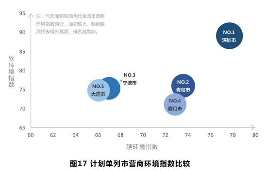 在五个计划单列市中,城市营商环境指数和软环境指数排名,深圳、青岛和宁波排名靠前,厦门、大连相对落后,其中,深圳的营商环境指数、软环境指数和硬环境指数均位列第一位,二级指标中基础设施环境、人才环境、技术创新环境、文化环境、金融环境也位列首位。